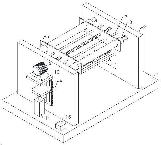 2.如权利要求1所述的一种分切机的张力控制机构,其特征在于,a调整机构包括a挡板(5)、a伺服电机(6)、a光杠(7)、a双向丝杠(8)、a圆口(9)和支撑板(10),两组a光杠(7)均固定安装在两组立板(2)之间,a双向丝杠(8)转动安装在两组立板(2)之间,两组a挡板(5)分别与两组a光杠(7)滑动连接,两组a挡板(5)分别与a双向丝杠(8)螺纹连接,每组a挡板(5)上分别设置有两组a圆口(9),支撑板(10)安装在一组立板(2)的外侧端,a伺服电机(6)安装在支撑板(10)顶端,a伺服电机(6)输出端连接a双向丝杠(8)前端,每组导辊(3)均套装在两组a圆口(9)的内侧。