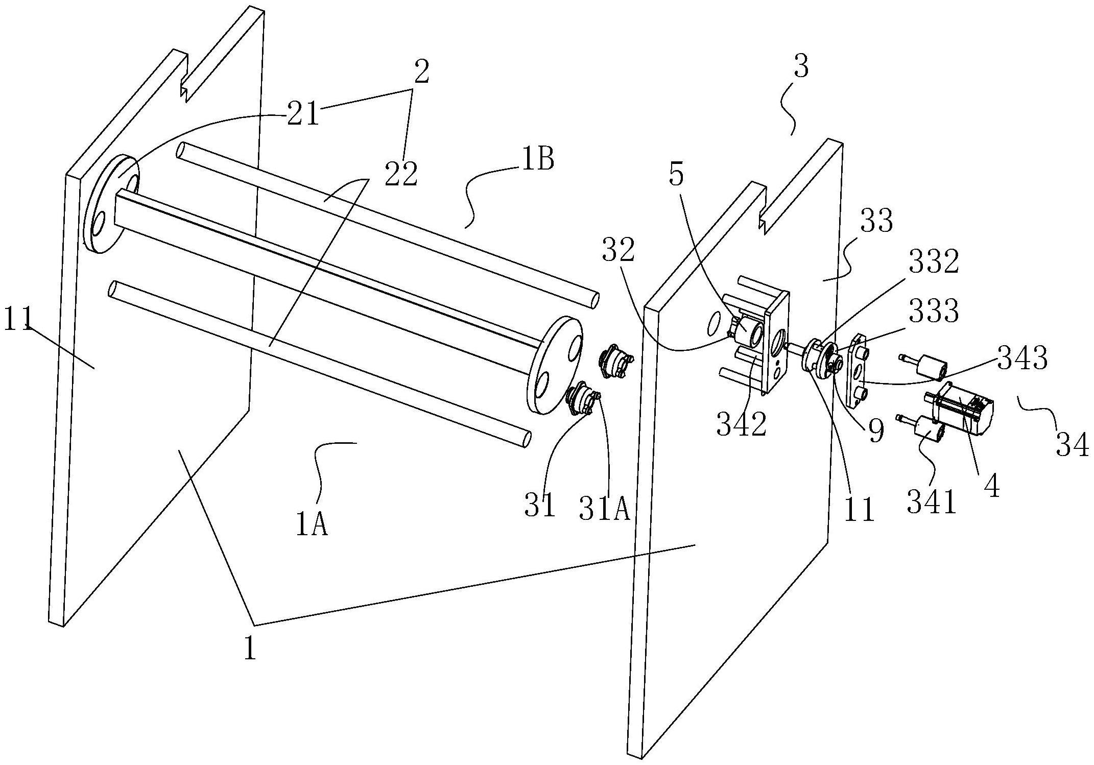5、收卷架,其包括架体及至少两收卷轴,各所述收卷轴可转动地装设于架体,且相对于架体的轴线偏心布置;各所述收卷轴与架体可拆卸连接;