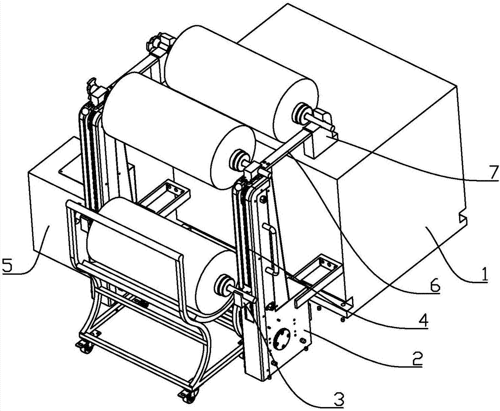 目前金属、塑料、纸等膜状、片状柔性物料原料幅宽度较大,而且重量重,个别能达几百斤,用人工上料废力废时,并且存在安全隐患。因此,为了使得上料变得简单快捷,进而提高生产效率,现需要一种分切机的上料机构。